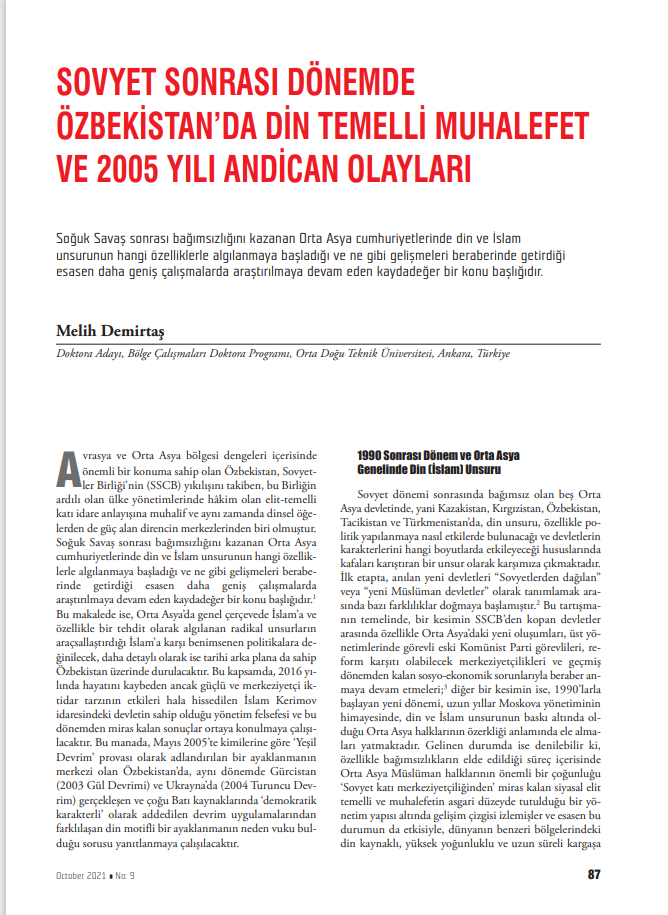 "SOVYET SONRASI DÖNEMDE ÖZBEKİSTAN’DA DİN TEMELLİ MUHALEFET VE 2005 YILI ANDİCAN OLAYLARI" BAŞLIKLI MAKALE -