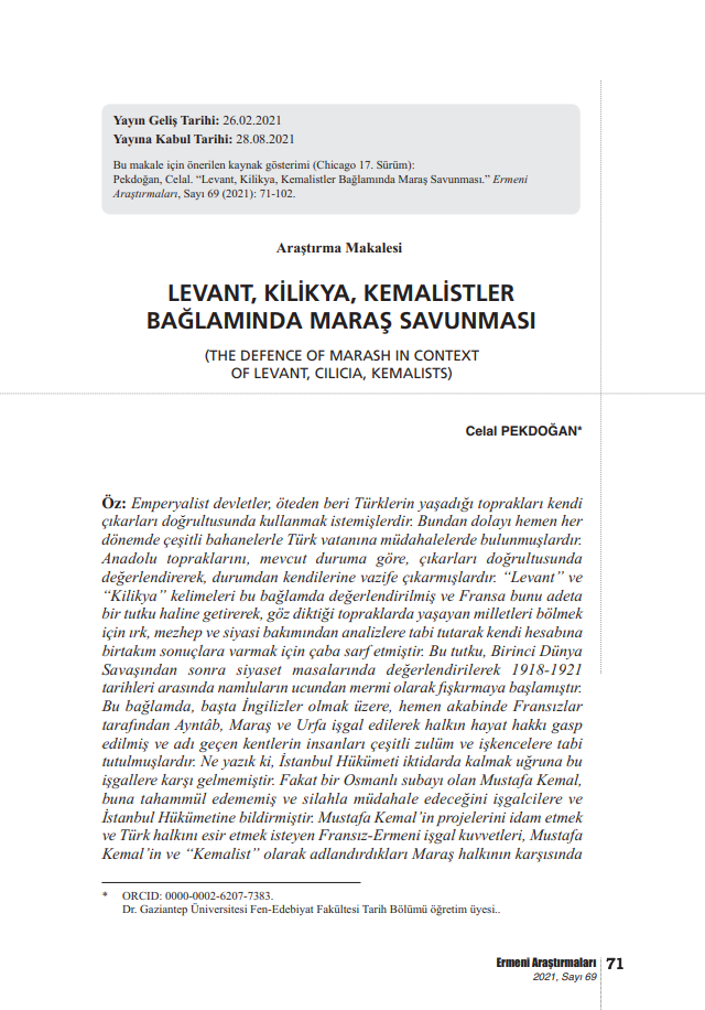 "LEVANT, KİLİKYA, KEMALİSTLER BAĞLAMINDA MARAŞ SAVUNMASI" BAŞLIKLI MAKALE -