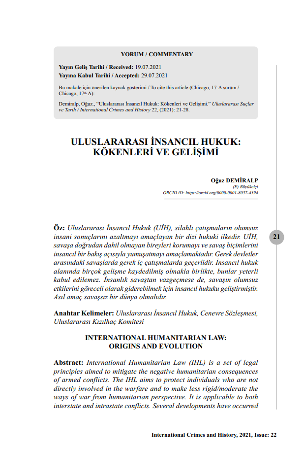 "ULUSLARARASI İNSANCIL HUKUK: KÖKENLERİ VE GELİŞİMİ" BAŞLIKLI MAKALE -