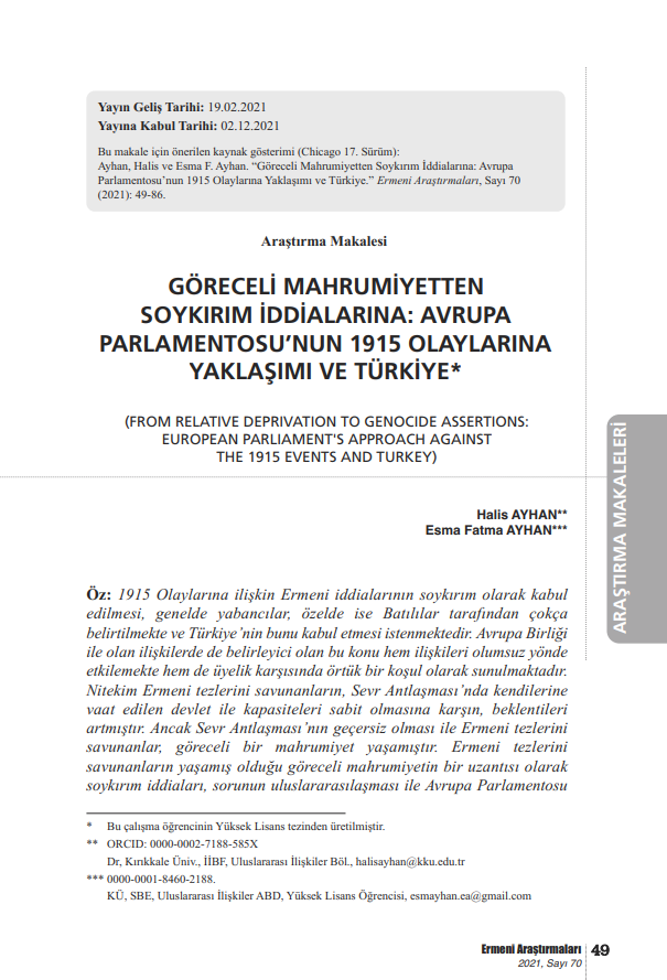 "GÖRECELİ MAHRUMİYETTEN SOYKIRIM İDDİALARINA: AVRUPA PARLAMENTOSU’NUN 1915 OLAYLARINA YAKLAŞIMI VE TÜRKİYE" BAŞLIKLI MAKALE -