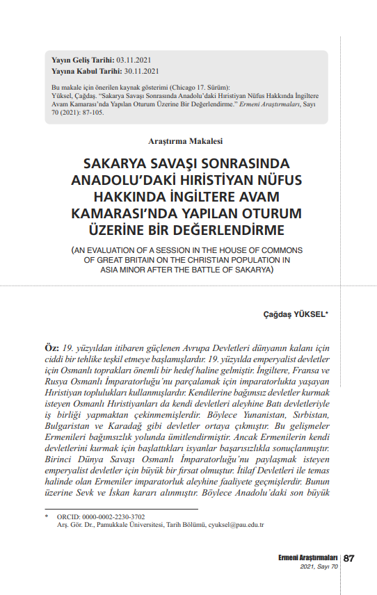"SAKARYA SAVAŞI SONRASINDA ANADOLU’DAKİ HIRİSTİYAN NÜFUS HAKKINDA İNGİLTERE AVAM KAMARASI’NDA YAPILAN OTURUM ÜZERİNE BİR DEĞERLENDİRME" BAŞLIKLI MAKALE -
