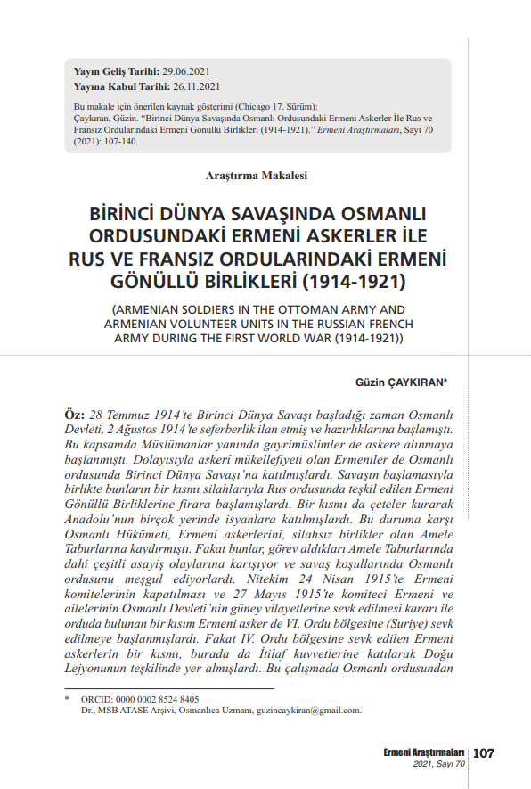 "BİRİNCİ DÜNYA SAVAŞINDA OSMANLI ORDUSUNDAKİ ERMENİ ASKERLER İLE RUS VE FRANSIZ ORDULARINDAKİ ERMENİ GÖNÜLLÜ BİRLİKLERİ (1914-1921)" BAŞLIKLI MAKALE -