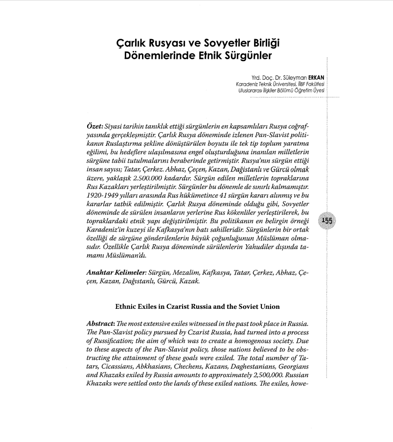 "ÇARLIK RUSYASI VE SOVYETLER BİRLİĞİ DÖNEMLERİNDE ETNİK SÜRGÜNLER" BAŞLIKLI MAKALE -