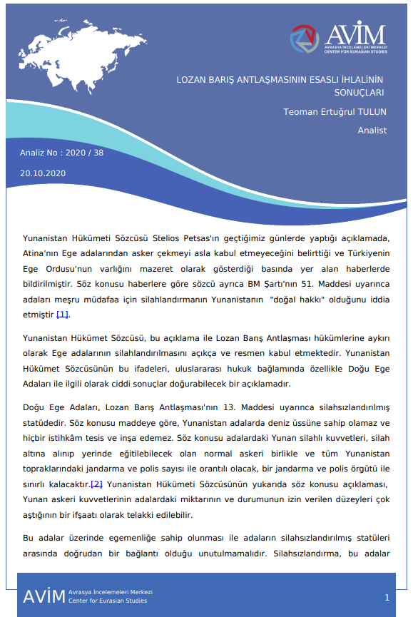 "LOZAN BARIŞ ANTLAŞMASININ ESASLI İHLALİNİN SONUÇLARI" BAŞLIKLI MAKALE -