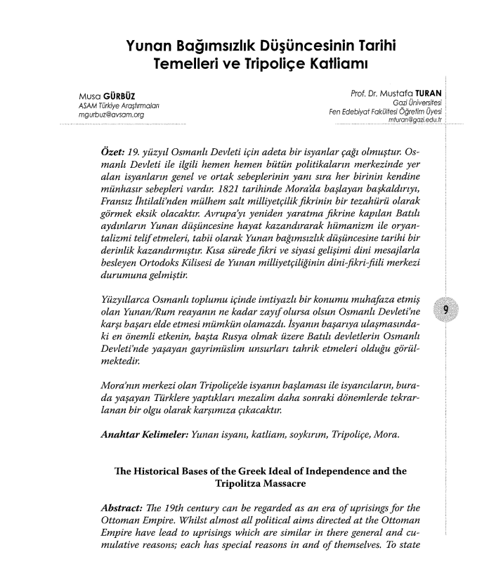 "YUNAN BAĞIMSIZLIK DÜŞÜNCESİNİN TARİHİ TEMELLERİ VE TRİPOLİÇE KATLİAMI" BAŞLIKLI MAKALE