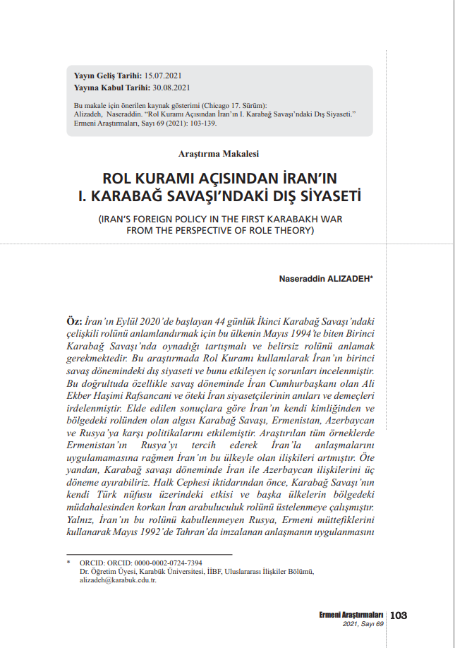 "ROL KURAMI AÇISINDAN İRANʼIN I. KARABAĞ SAVAŞIʼNDAKİ DIŞ SİYASETİ" BAŞLIKLI MAKALE -