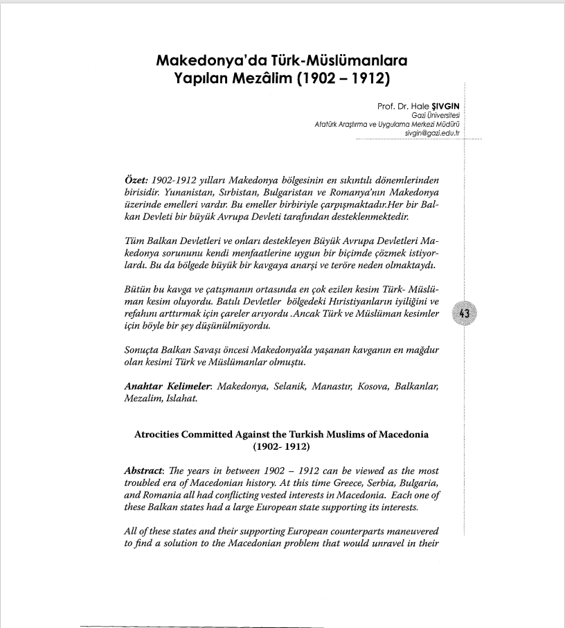 "MAKEDONYA’DA TÜRK-MÜSLÜMANLARA YAPILAN MEZALİM (1902 -1912)" BAŞLIKLI MAKALE -