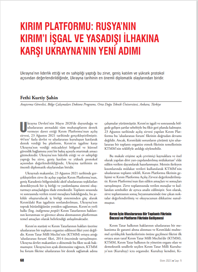 "KIRIM PLATFORMU: RUSYA’NIN KIRIM’I İŞGAL VE YASADIŞI İLHAKINA KARŞI UKRAYNA’NIN YENİ ADIMI" BAŞLIKLI MAKALE -