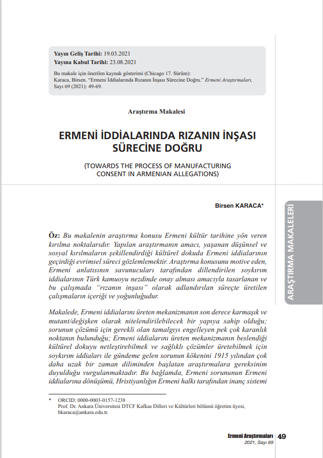 "ERMENİ İDDİALARINDA RIZANIN İNŞASI SÜRECİNE DOĞRU" BAŞLIKLI MAKALE -